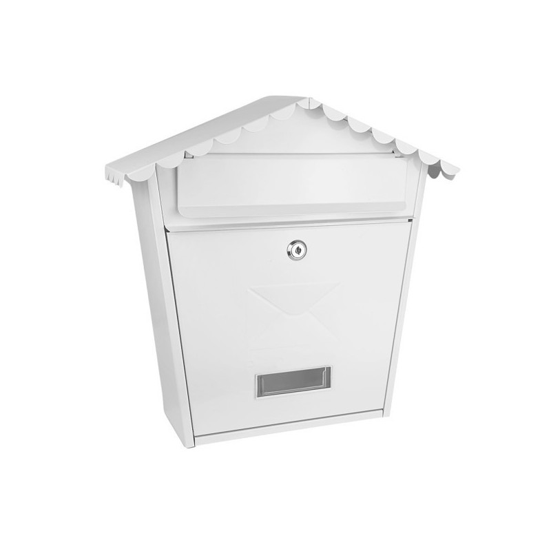 Buzón de correos de la serie OLENA en color BLANCO. Realizado en Acero Galvanizado, material resistente y duradero, preparado para colocar en pared en el exterior. Fácil de instalar y de diseño, tanto para viviendas unifamiliares como para locales, garajes y centros de trabajo. Se presenta con un bonito tejadillo decorativo en forma de casita, grabado con un sobre, ranura con tapa abatible para protección anti lluvia, ventana de identificación, cerradura de cilindro con 2 llaves y apertura de puerta frontal, lo que lo hace muy cómodo a la hora de retirar su correo. Tiene unas dimensiones de 37x36x13,5 centímetros, con capacidad para correo DIN A4 y revistas, catálogos, etc. Modelo disponible en color negro, verde o blanco.